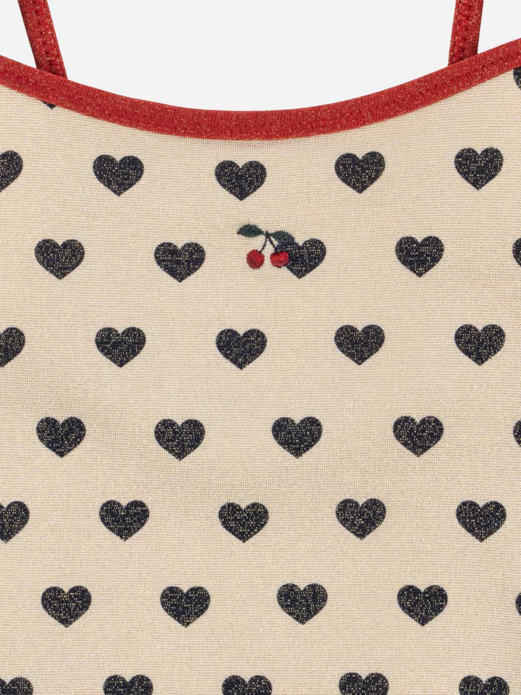 The sweetest one piece swimsuit by Konges Sløjd. We love this glitter fabric that is quick-drying, comfortable and stretchy. This design is covered in little hearts, with red glitter straps and embroidered cherries on the front. Always rinse your swimmers out in cold water when your done x